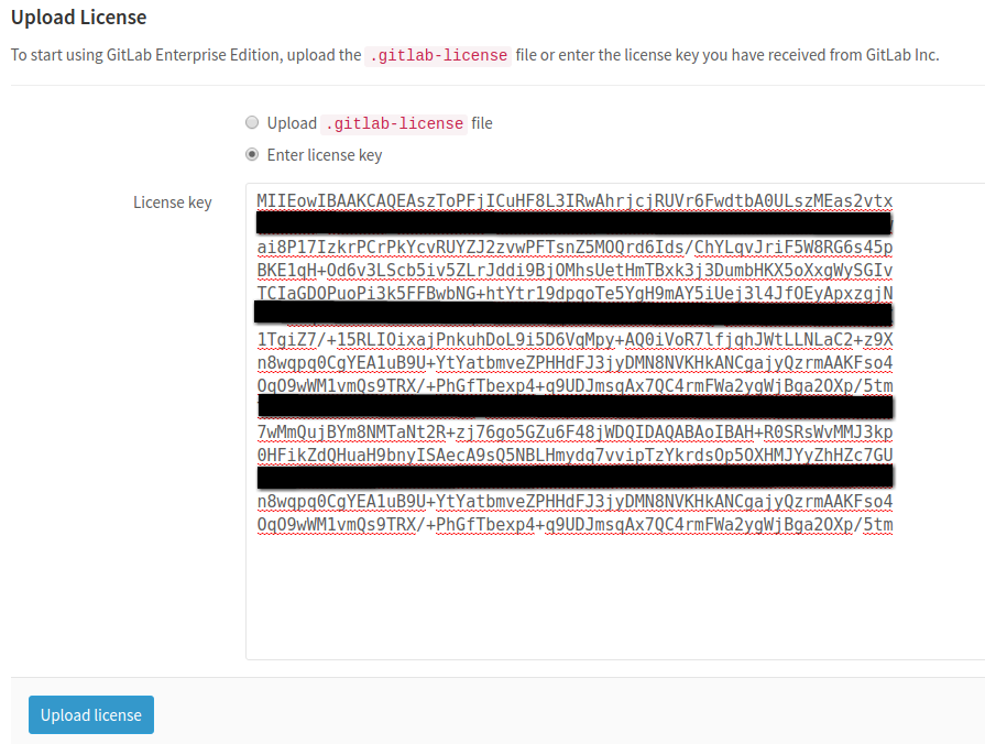 The license has the form of a base64 encoded ASCII text with a .gitlab-license