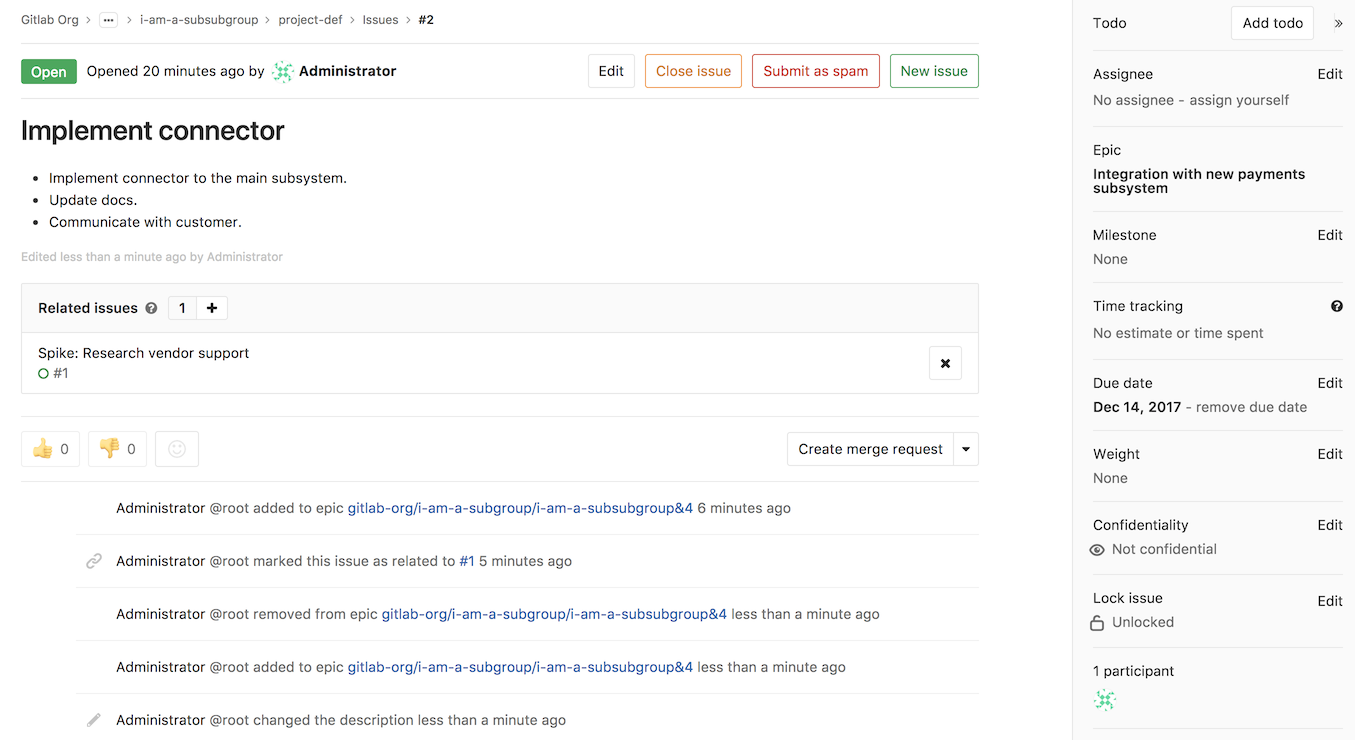An epic contains a list of issues, and an issue can be associated with at most one epic. You can add issues associated with the epic by clicking the plus icon (+) under the epic description, pasting the link of the issue, and clicking Add. Any issue belonging to a project in the epic's group or any of the epic's subgroups are eligible to be added. To remove an issue from an epic, simply click on the x button in the epic's issue list.