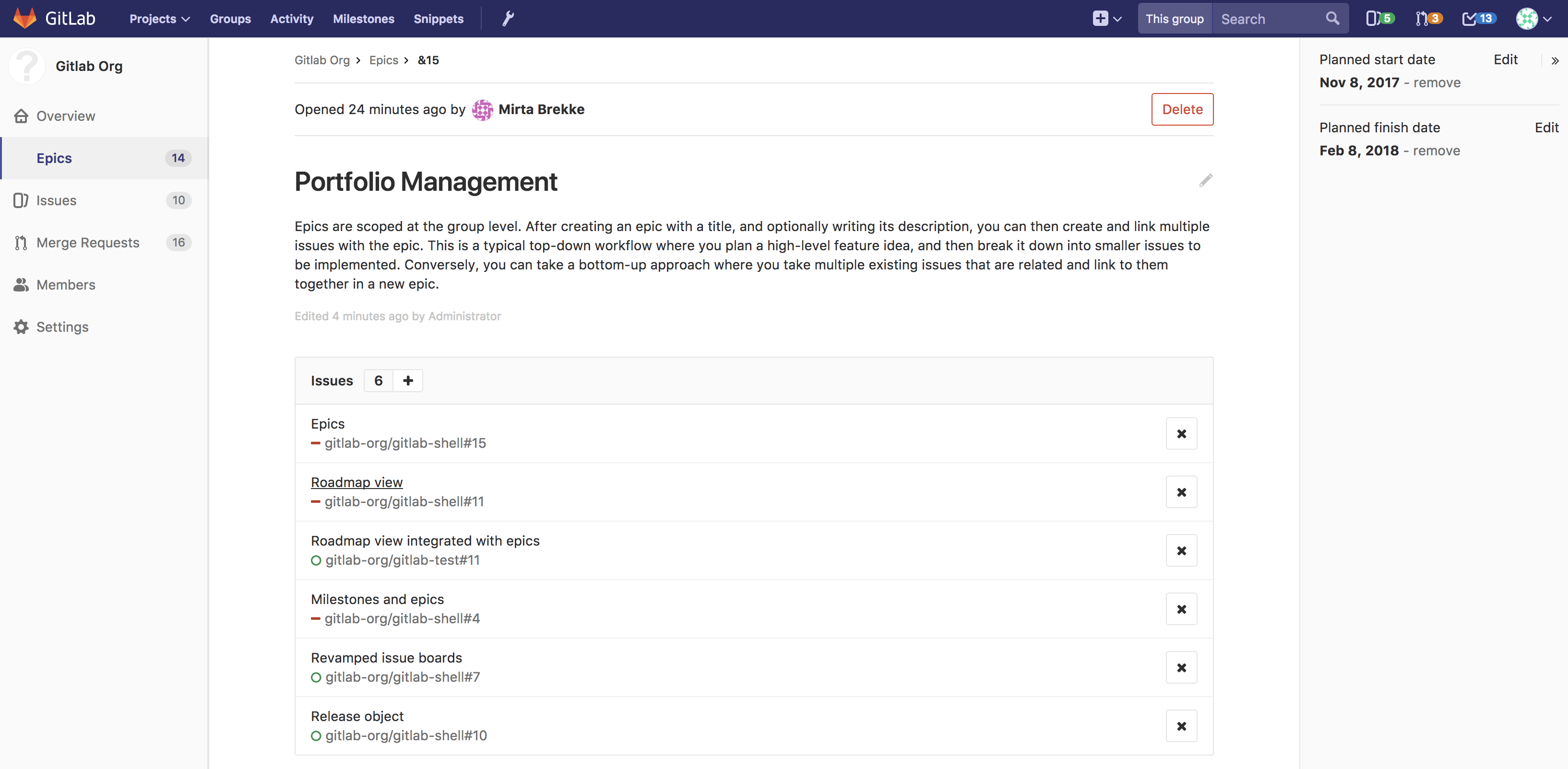 Once created, you will be taken to the view for that newly-created epic where you can change its title, description, planned start date, and planned end date. The planned end date cannot be before the planned start date (but they can be the same day).