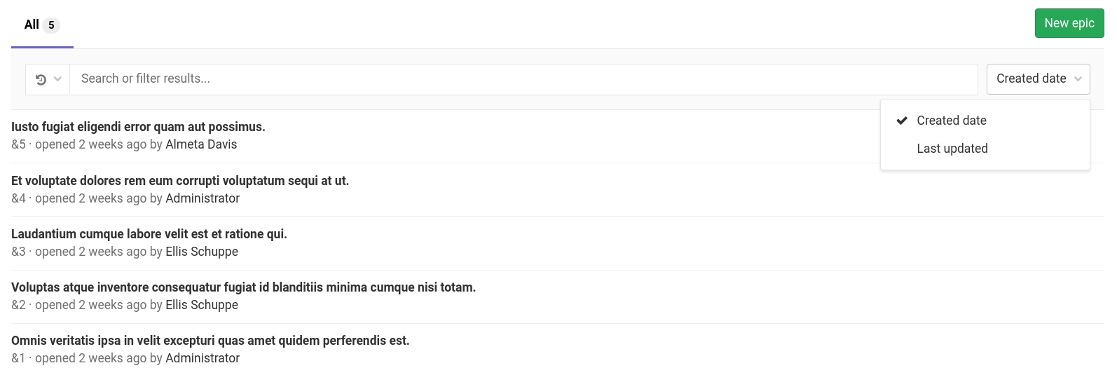 You can also sort epics list by Created date or Last updated.