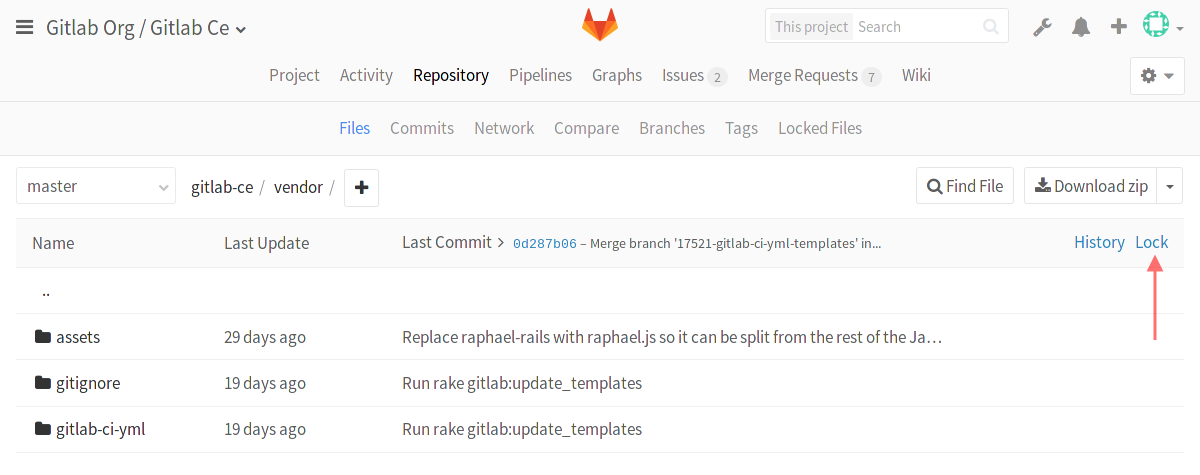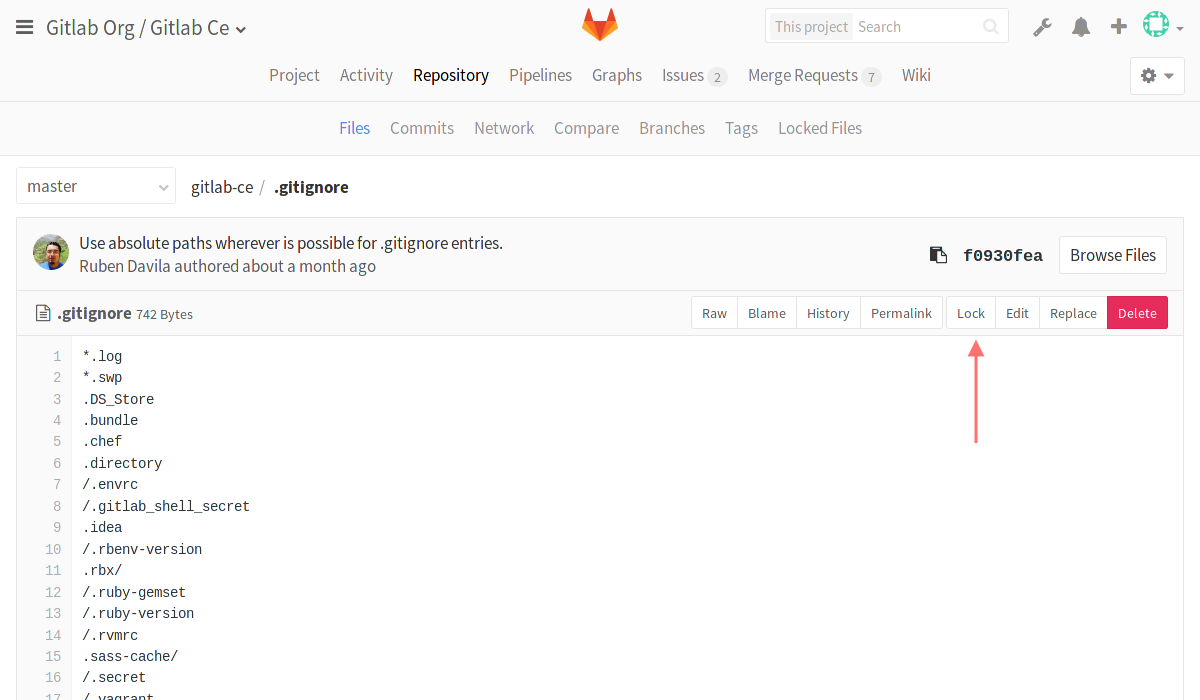 Note: Locking only works for the default branch you have set in the project's settings (usually