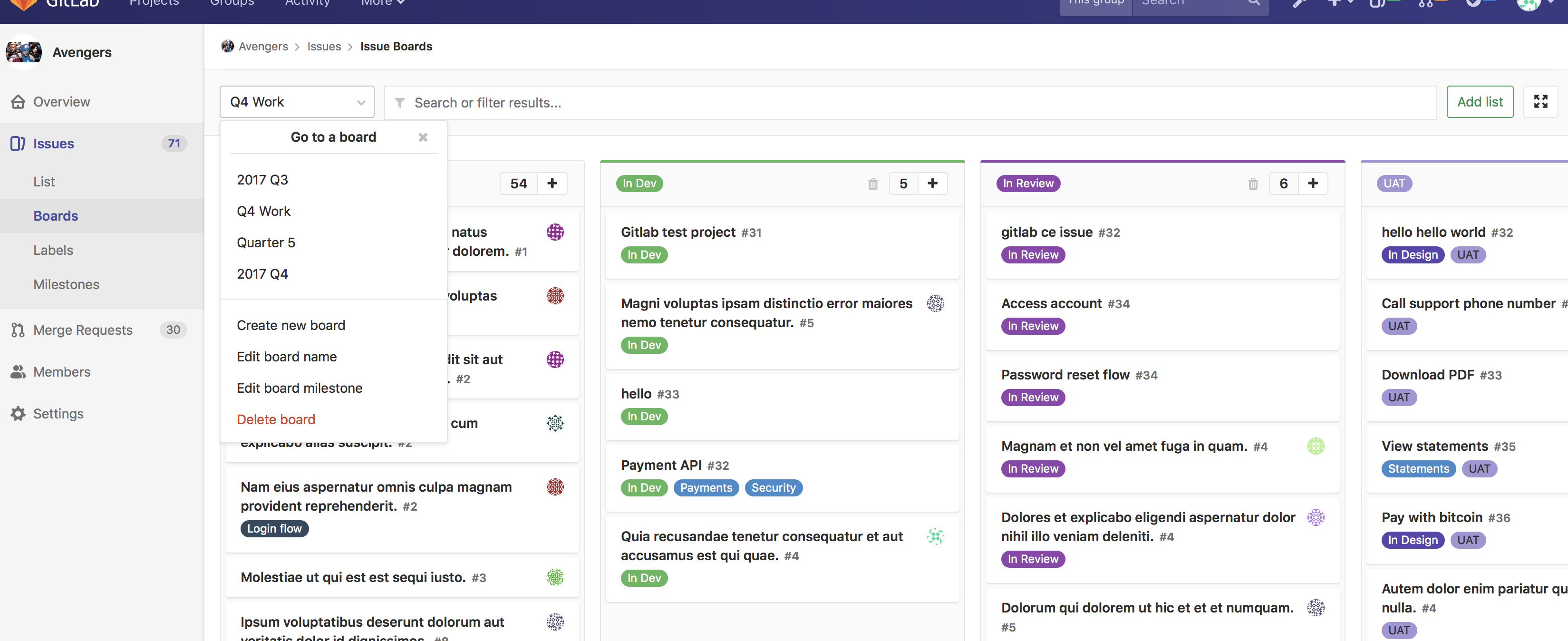 With Multiple Issue Boards, available only in GitLab Ultimate, you go even further, as you can not only keep yourself and your project organized from a broader perspective with one Issue Board per project, but also allow your team members to organize their own workflow by creating multiple Issue Boards within the same project.