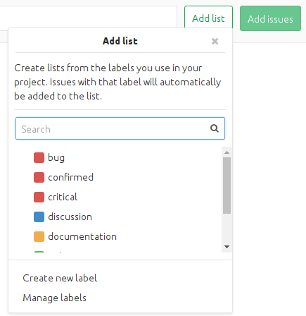 - Label list: a list based on a label. It shows all opened issues with that label.