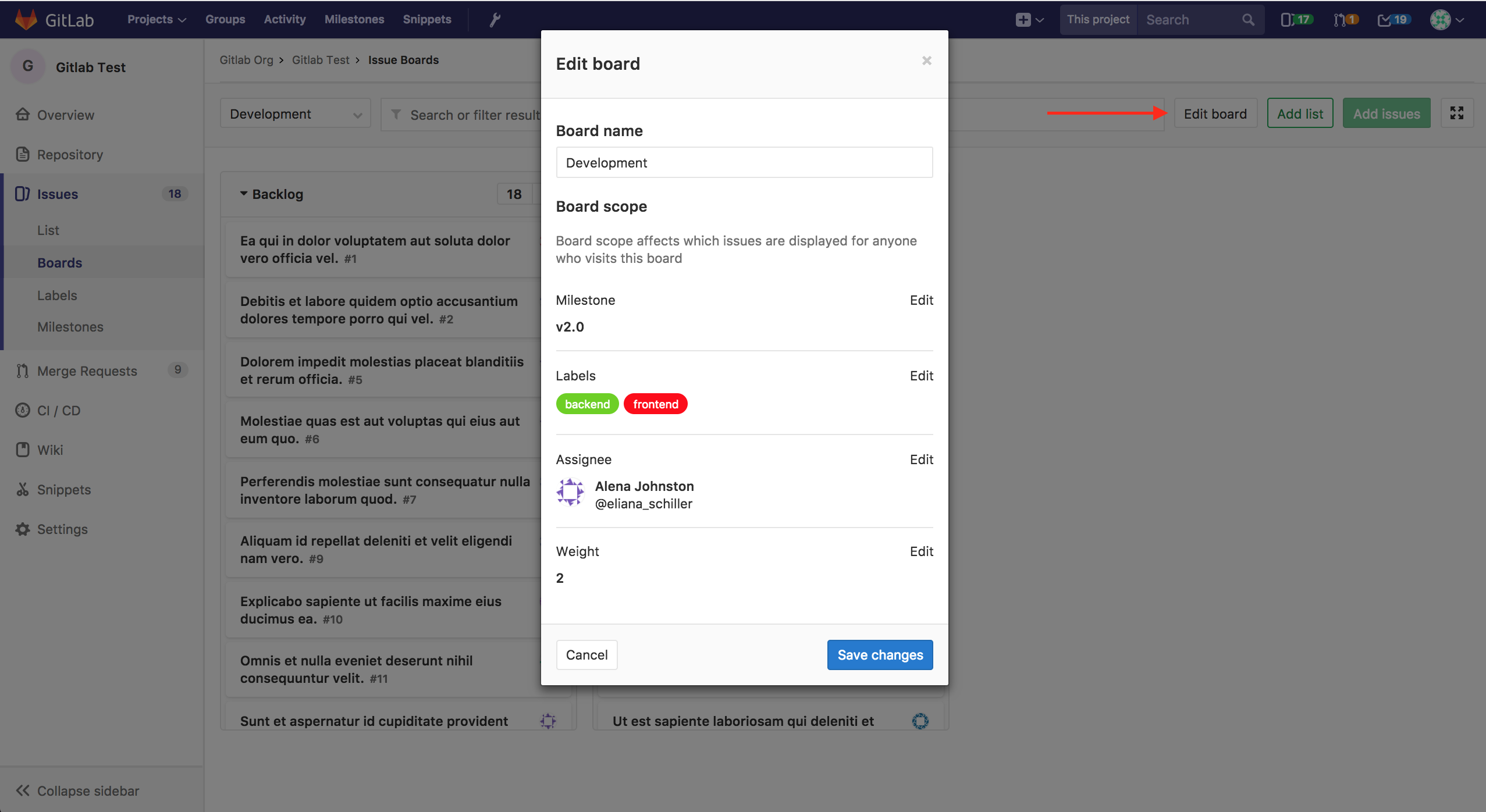 Group issue board is analogous to project-level issue board and it is accessible at the group navigation level. A group-level issue board allows you to view all issues from all projects in that group (currently, it does not see issues from projects in subgroups). Similarly, you can only filter by group labels for these boards. When updating milestones and labels for an issue through the sidebar update mechanism, again only group-level objects are available.