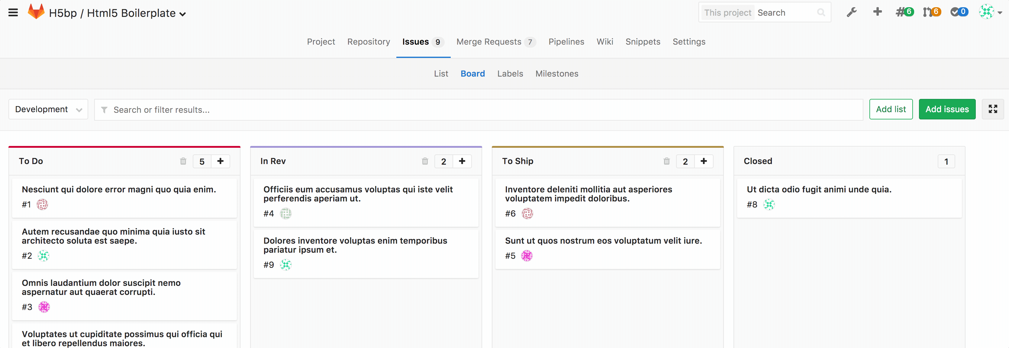 With the Issue Board you can have a different view of your issues while maintaining the same filtering and sorting abilities you see across the issue tracker. An Issue Board is based on its project's label structure, therefore, it applies the same descriptive labels to indicate placement on the board, keeping consistency throughout the entire development lifecycle.