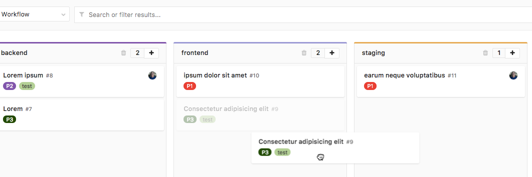 By reordering your lists, you can create workflows. As lists in Issue Boards are based on labels, it works out of the box with your existing issues. So if you've already labeled things with 'Backend' and 'Frontend', the issue will appear in the lists as you create them. In addition, this means you can easily move something between lists by changing a label.
