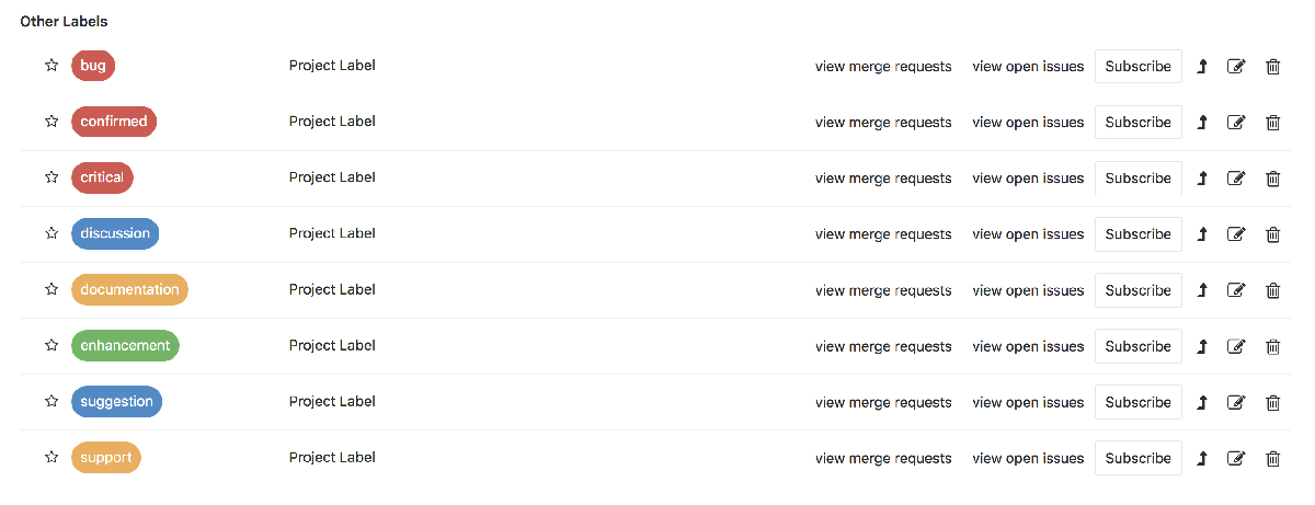 From the project label list page, star a label to indicate that it has a priority. Drag starred labels up and down to change their priority. Higher means higher priority. Prioritization happens at the project level, only on the project label list page, and not on the group label list page. However, both project and group labels can be prioritized on the project label list page since both types are displayed on the project label list page.