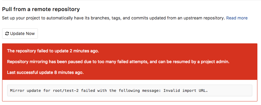 Once the mirror repository is updated, all new branches, tags, and commits will be visible in the project's activity feed. Users with at least developer access to the project can also force an immediate update with the click of a button. This button will not be available if the mirror is already being updated or 5 minutes still haven't passed since its last update.