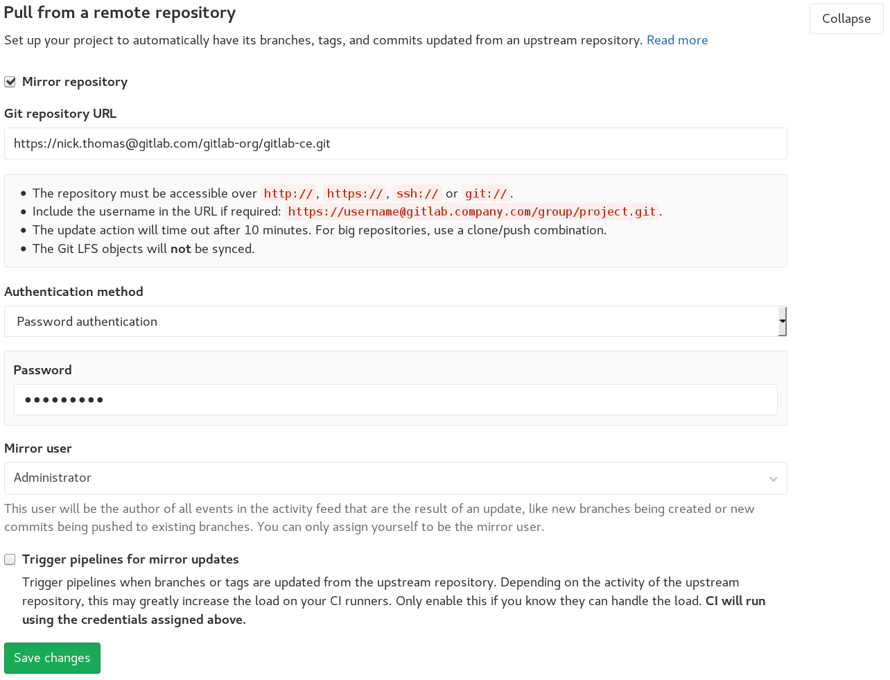 For an existing project, you can set up mirror pulling by visiting your project's Settings ➔ Repository and searching for the "Pull from a remote repository" section. Check the "Mirror repository" box and hit Save changes at the bottom. You have a few options to choose from one being the user who will be the author of all events in the activity feed that are the result of an update. This user needs to have at least master access to the project. Another option is whether you want to trigger builds for mirror updates.